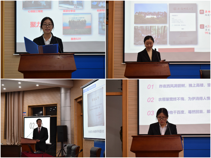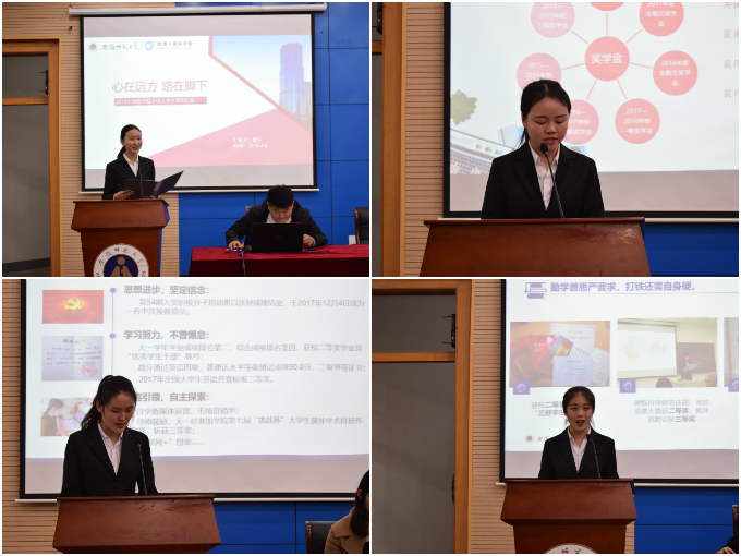 初评选拔,最终走上了评选汇报席。各参赛选手凭借特色鲜明的PPT,慷慨激昂亦或娓娓道来的演讲汇报了自己大学的成长历程和卓越成绩。五分钟,道不尽曾经的奋斗;五分钟,说不完未来的目标。但每个五分钟都让现场观众心灵震撼,受益良多,赢得全场热烈掌声。