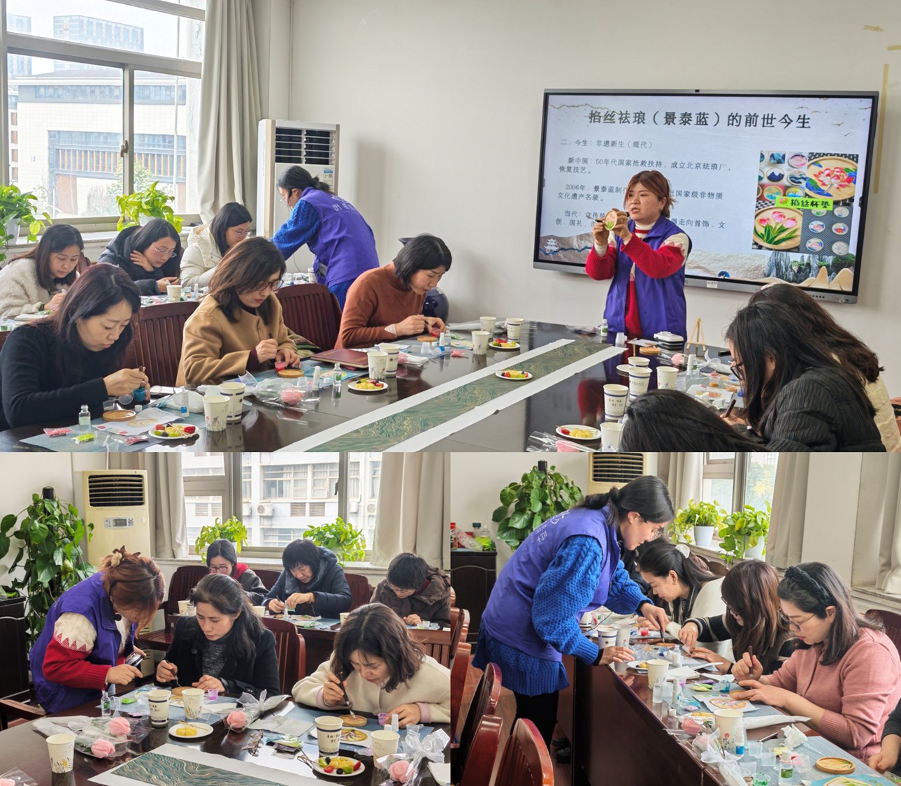 活动现场,指导教师详细讲解了掐丝珐琅杯垫制作的方法、技巧,面对面交流、手把手指导,每位老师都精心雕琢自己的非遗作品,一撇一捺、一点一滴尽显匠心,现场欢声笑语不断、气氛温馨热烈,让大家在繁忙的工作之余放松了心情、增进了友谊、密切了感情。
