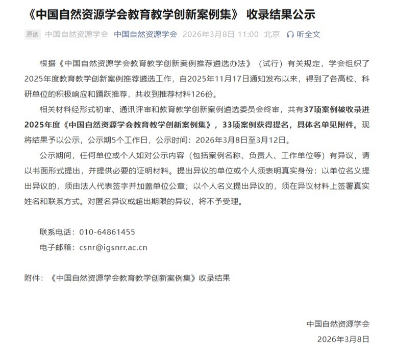 2026年3月8日,中国自然资源学会公示2025年度教育教学创新案例收录结果,91论坛