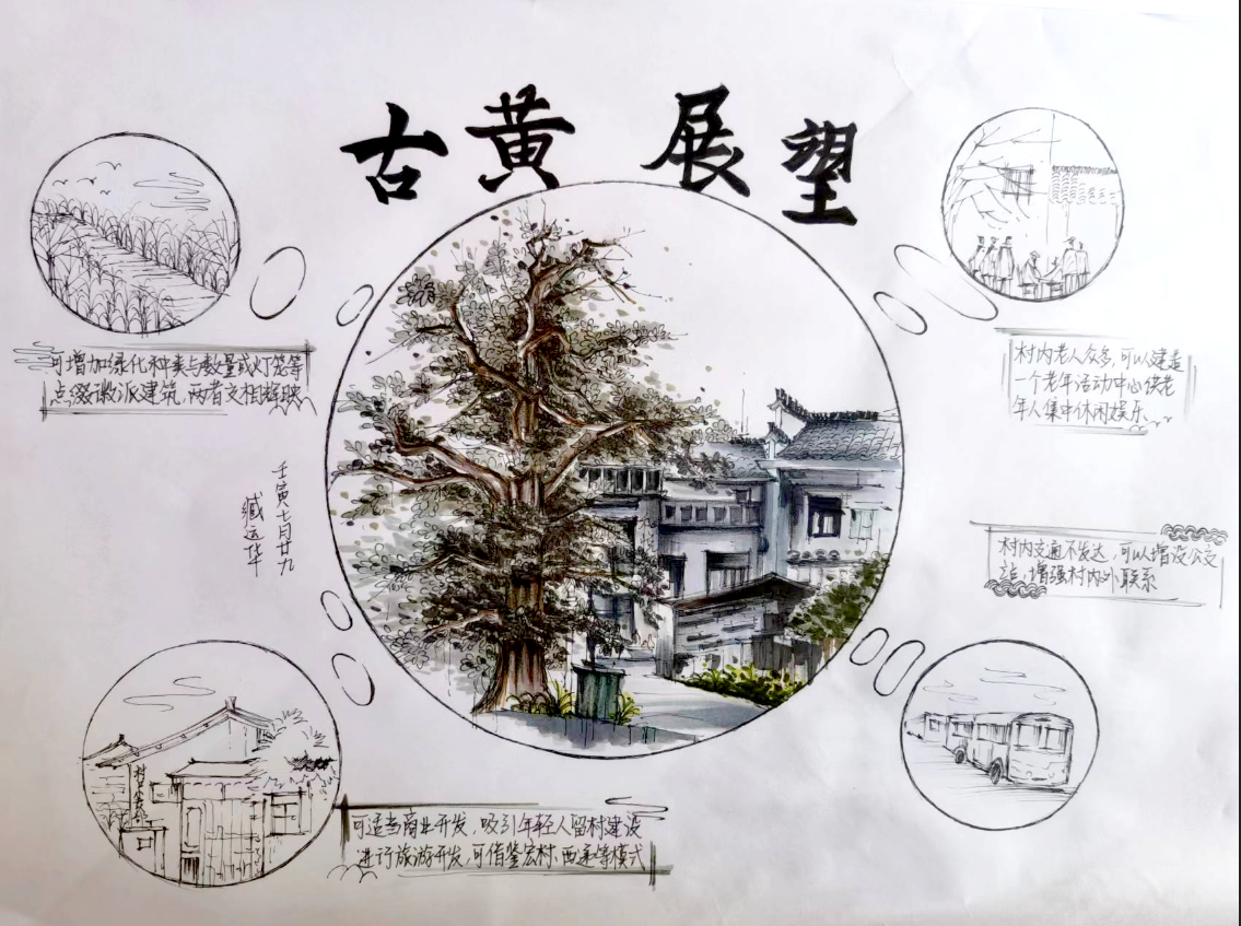 为了更全面了解皖南古村落的空间布局形态,在接下来的日程安排中,同学们分别前往了屏山、西递、碧山村以及古黄村进行实地考察和写生取景。通过不同地区的建筑对比及村落布局差异研究,促使城规同学从中发掘问题、提出思考,在锻炼专业绘画能力的基础上提升自身专业素养和人文关怀以及实习技能。其中,古黄村为安徽省高等院校大学生乡村规划建设方案竞赛的基地,同学们在考察过程中,初步提出规划设想,并以手绘图文的形式进行总结。