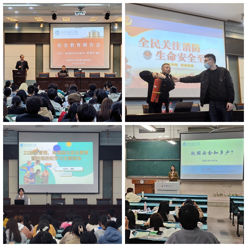 1828名本科生作安全教育专题报告,他从“网络安全”“政治安全”“消防安全”“交通安全”“治安安全”“防诈骗安全”等六个方面,为同学们详细讲解了身边常见的安全类型,现场演示了灭火器使用、防侵害自我保护等技能,并重点讲解了当前电信网络诈骗面临的新形势新特点,增强了同学们的安全意识。此外,辅导员利用主题班会、安全知识竞赛等方式为同学们科普安全知识,营造比学赶超学习安全知识的氛围。班级组织开展“校园安全知多少”、“逐梦向阳,从心出发”等主题班会,促进同学们身心健康发展。