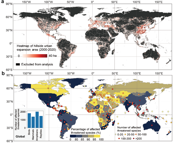 近日,我院施开放教授与其合作者在国际知名学术期刊《Nature Cities》上发表题为《Extensive terrestrial biodiversity threats from global hillside urban expansion》的研究论文。施开放教授为论文的第一作者,华东师范大学余柏蒗教授,91论坛