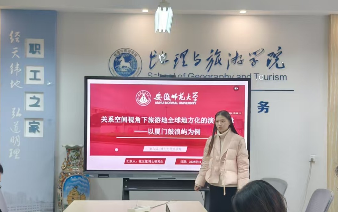 博士研究生花玉莲作《关系空间视角下旅游地全球地方化的演进逻辑——以厦门鼓浪屿为例》专题报告。她从关系空间视角出发,探讨了旅游地在全球化与地方化相互作用下的演变过程,通过对鼓浪屿的案例研究,揭示了文化、社会和经济因素如何共同塑造旅游地的空间特征和发展路径。