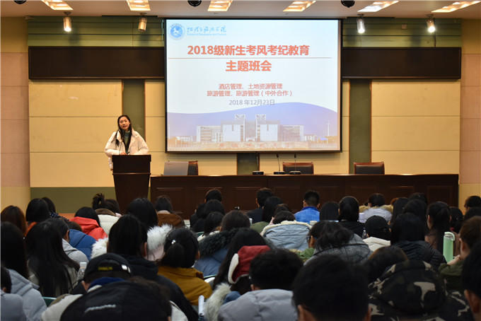 始终高度重视学生学风、考风建设,2018级酒店管理、旅游管理、旅游管理(中外合作)、土地资源管理专业致力于形成积极进取的学风、诚信守规的考风。本次考风考纪主题教育班会的举办,以期为同学们明确考试纪律、端正考试态度,促进学风班风建设发挥重要作用。