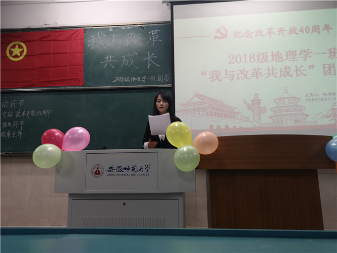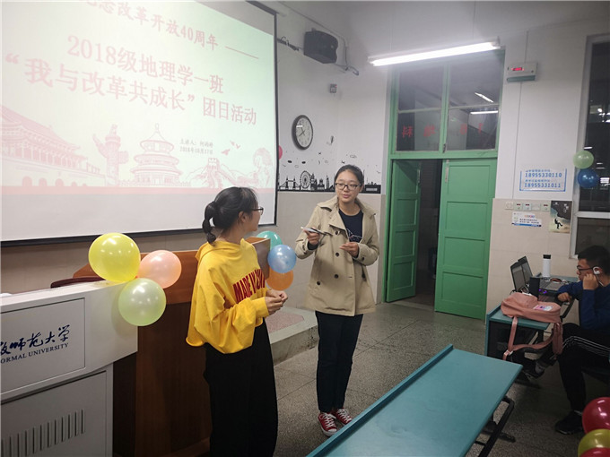 2018级地理学一班于2040204教室举办了“我与改革共成长”主题团日活动。由地理学一班的团支书何雨婷主持,2018级地理学一班辅导员王阳及全体同学参与。