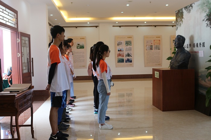 队员们到丹霞山的第一天就便瞻仰了丹霞山博物馆三楼——纪念彭华教授主题展览。展板前,队员们缓缓移动着步伐,静默不语,一块又一块,泪水在眼眶中打转,脚步声也变得愈发低沉。彭华先生铜像前,久久凝视不愿离去,深深的为先生鞠了一躬,道不尽的思念与惋惜。团队指导老师吴立到丹霞山后没有立即与同学们会合而是去锦石岩寺下院怀缅彭华先生。“高山仰止,景行行止。丹山赤赤,锦江泱泱,先生之风,山高水长。”吴立动情地说。