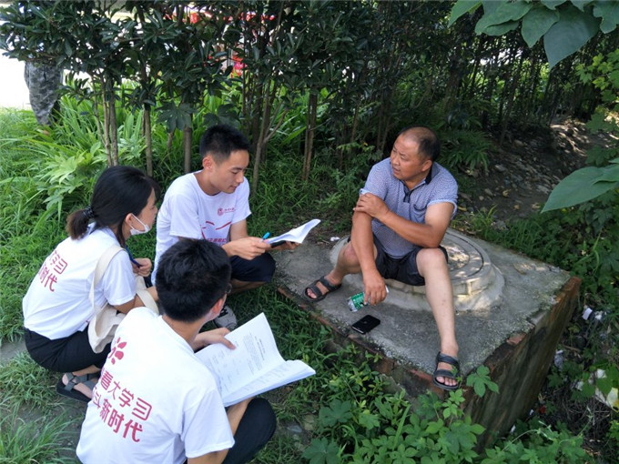 本队队员总共被分成三大组,两人或三人为一小组。首先,队员们在学府路南段周围的金马镇驾校分别对五名老人、一位青年、一位中年人进行了问卷访谈,在对当地老人的访谈过程中,每小组分为三人,由于语言不通,一名四川本地的队员一名对受访者进行深入的访谈式调研,另外的两人负责录音和拍照的工作。在访谈过程中,老人们参与度较高,配合性强,调研工作取得初步进展。此外,本队还前赴金马镇镇政府进行问卷调研,并在金马镇政府前拍照留念。