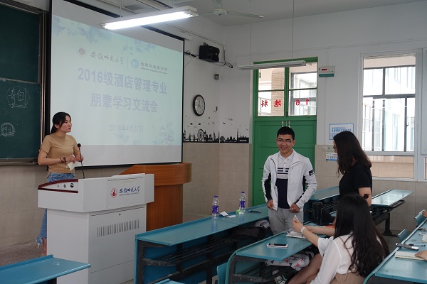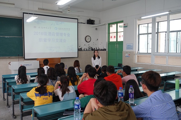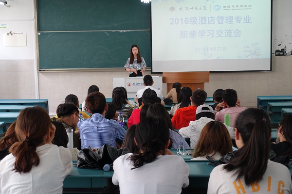 王文燕、刘冠琪)了解专业特色,明确前景发展。4月27日下午,2016级酒店管理专业召开朋辈学习经验交流会, 2014级旅游管理石禹芮、张鑫、胡璇应邀出席,会议由辅导员刘冠琪主持,2016级酒店管理专业全体同学参会。