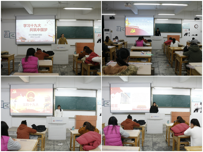 活动第一项是16级城乡规划班级4个团小组对于学习十九大的主题汇报。他们分别针对十九大的内容、精神和感想等进行了ppt汇报。在行政组的汇报中,汇报人以十九大精神为主要内容,总结了小组内各个同学对于十九大精神的学习成果;就业组则以十九大赋予城乡规划新使命为主要内容,详细介绍了十九大中有关城乡规划这个领域的知识;考研组以十九大有关社会新矛盾做了一些组内的见解,认为当代大学生应该着眼于现实问题,努力用自身微薄力量为社会矛盾的消除贡献着;创业组是以十九大内容解读和组内成员学习心得为主要汇报内容,在心得中,更是将十九大精神与城乡规划这个专业做了结合,表示要响应党的号召,学好专业知识为祖国建设贡献自己的一份力量。汇报期间每位同学都认真聆听,并给予掌声。