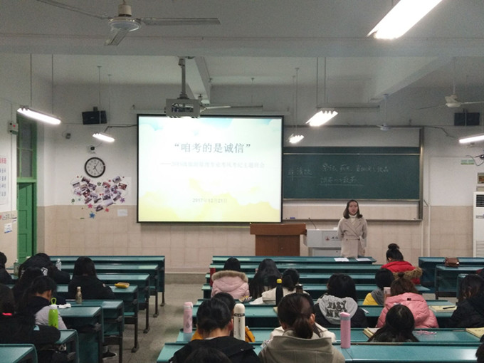 郭雨琪)期末考试将至,为了培养学生树立“诚信考试,考出真本领”的理念,以积极向上的状态迎接和准备即将到来的期末考试,12月21日下午,2015级旅游管理专业于2040203召开了以“咱考的是诚信”为主题的班会。