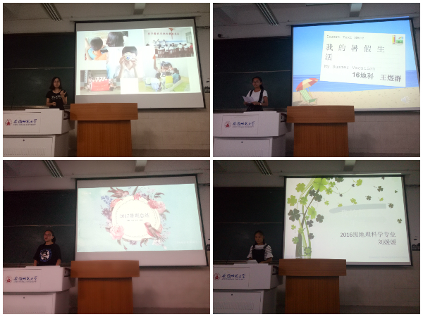 交流分享会的主要是通过PPT的形式进行汇报,择优选出的十多名同学通过自己精彩的演讲,展现了各色各样,丰富多彩的暑假生活。有参加暑期社会实践的同学,由于专业不同,因此也经历的也是完全不同的社会实践之旅。地理科学专业的刘媛媛同学是一个腼腆的姑娘,刚刚站上讲台时她还有些羞涩,但说到自己的社会实践经历时她却如鱼得水,将自己的故事娓娓道来,她说到:“这次的芜湖白马实验中学教学之旅让我印象深刻,虽然只带了两节特色音乐课,但这次的经历也让我有所成长,对我的师范生技能锻炼起着重要作用”。除了参加支教,陈婕同学则选择一种形式完全不同的社会实践,她的工作可不一般,需要足够的勇气:走上街头,与陌生人进行交谈,采访到自己想要的讯息,这其中学到的、收获的或许能让她真正得到成长。选择不同,收获的体验和感悟自然不同。正是这些不同的体验和经历才构成了每个人不同的人生。这样的多姿多彩才是生活应有的面貌,这样的多姿多彩也才是最值得纪念的青春。暑期归来,同学们都成长了许多,带着更成熟的心态走进大二,走进新的学年。