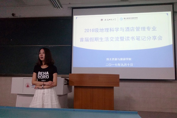 2016级地理科学与酒店管理全体同学于行知楼2040204举办首届2016级地科酒管假期生活交流暨读书笔记分享会,同学们通过展示,既促进了感情的交流,又相互借鉴共同学习。会议由辅导员刘冠琪主持。