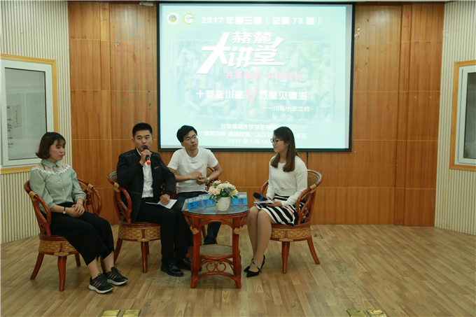 王竞钊)回眸十年支教路,守护心灵远征程。2017年5月12日晚,由校学习部与川队联合举办的主题为“十载赴川路,万里见情深”的第78期赭麓大讲堂在花津校区团委多功能厅开讲。川队前任队长袁成、李明和王阳应邀来到现场,与同学们分享他们在暑期赴四川支教中的收获与心得。讲座由川队成员陈思敏主持。