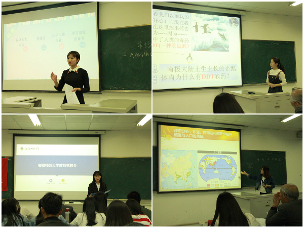会议伊始,主持人薛明珂上台为大家介绍本次比赛的流程及规则,每位选手按照抽签顺序依次上场比赛,进行汇报,时间不得超过10分钟。本次比赛共有7位选手参加,各位选手的语言表达、逻辑思维、精神状态等方面都展示出师大学子的教学技能基本功。如来自2015级地理科学专业的朱珠同学,其比赛的主题是《季风水田农业》。该同学从上节课结束的知识点开始导入本节课的内容,向同学们详细地介绍了季风水田农业的概念及其作用,讲课期间向同学提问,积极与学生互动,课堂气氛十分活跃。2015级人力资源管理专业的许金连同学,其讲课的主题是《市场细分》,该同学已五组洗发水广告开头,吸引了大家的注意力,然后综合分析了市场细分的作用及标准,结构安排紧凑合理。2014级播音与主持艺术专业的郑小颖同学,其讲课主题是《播音主持语音基础》,该同学介绍了普通话的情况,带同学认识了口腔的发音位置,以不同的事例让同学们更加清楚地了解了不同的发音问题,并喊同学示范读词语,总结了同学们易混淆的发音问题。