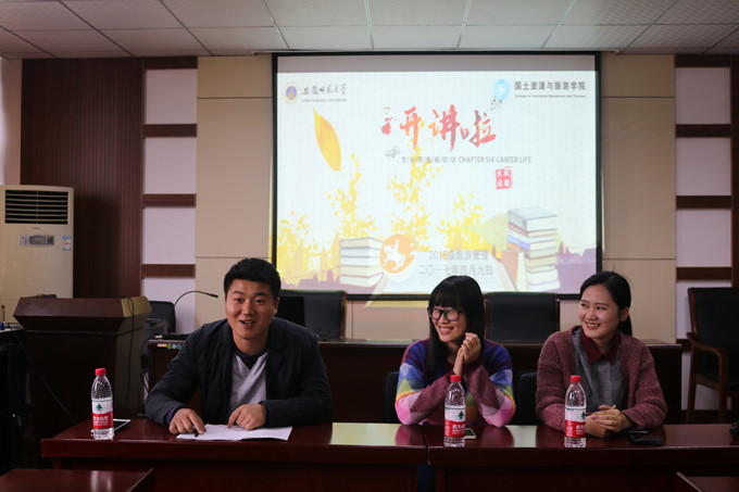 2015级旅游管理专业2班邀请考研优秀学子代表戴玉习同学及优秀就业代表李淇同学为大家开展系列讲座,浅谈考研与就业,讲座由实践辅导员张杰主持。