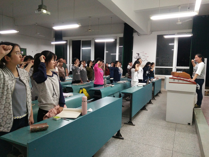 活动伊始,帅林茹便向大家提出什么是“一学一做”的问题?座位上的同学们争相回答。随后,帅林茹以ppt的形式带大家再次学习熟悉了团史及团规的重要内容。学习结束后,班级同学全体起立,重温入团誓词,同学们高举右手,对着鲜艳的团旗庄严宣誓。“我志愿加入中国共产主义青年团…”,活动在阵阵嘹亮声中步入高潮。