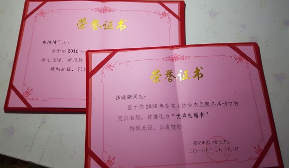 等高校志愿公益协会举办的各类爱心活动。接着志华爱心团队副会长洪鹏飞发表了讲话并宣布2016年度志华爱心表彰大会开始。主持人宣布优秀志愿者名单,我校爱心者协会志愿者胡舒沁、秦秋明、汪慧、姚翠、张晓晓等10名志愿者上台接受表彰,荣获“优秀志愿者”称号。大会结束后,我校爱心者协会指导老师刘冠琪及优秀志愿者与程志华老师合影留念。