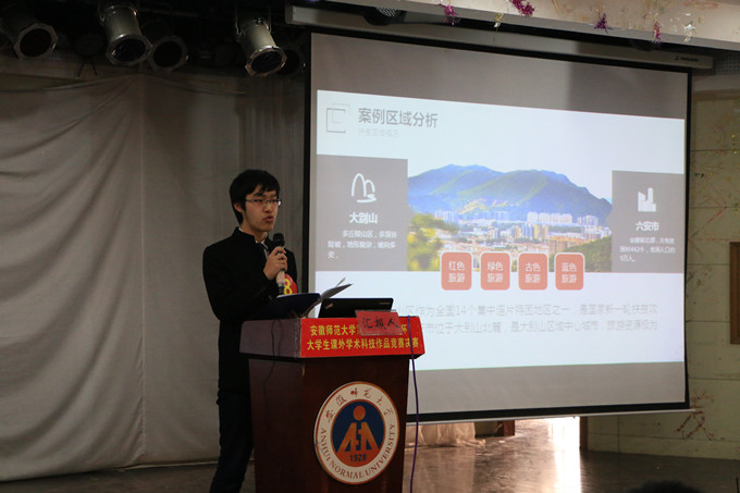 子勇于创新、敢于挑战的青春风采。14级旅游管理梁宜人同学的《连片特困区旅游精准扶贫新模式:廊道扶贫——以大别山贫困区核心区域安徽省六安市为例》,以旅游扶贫为切入点,分析了廊道扶贫模式对于连片贫困区的科学有利之处。14级旅游管理胡程等同学的《美丽乡村+旅游的融合发展路径研究――以滁州环城美丽乡村示范带为例》,依据滁州的特殊地理位置和自然条件,提出了以美丽乡村建设吸引旅游发展的创新性路径模式;14地理科学温庆志等同学的《基于多源数据的淮河流域干旱监测模型构建及应用》利用空间监测系统和数据模型,对于对淮河流域一段时期内的干旱情况进行实时性监测。14级地理信息科学张海琴等同学的《城市生活服务小贴士》用创新的视角和方法为现代城市居民出行和生活方式提供了诸多小窍门。