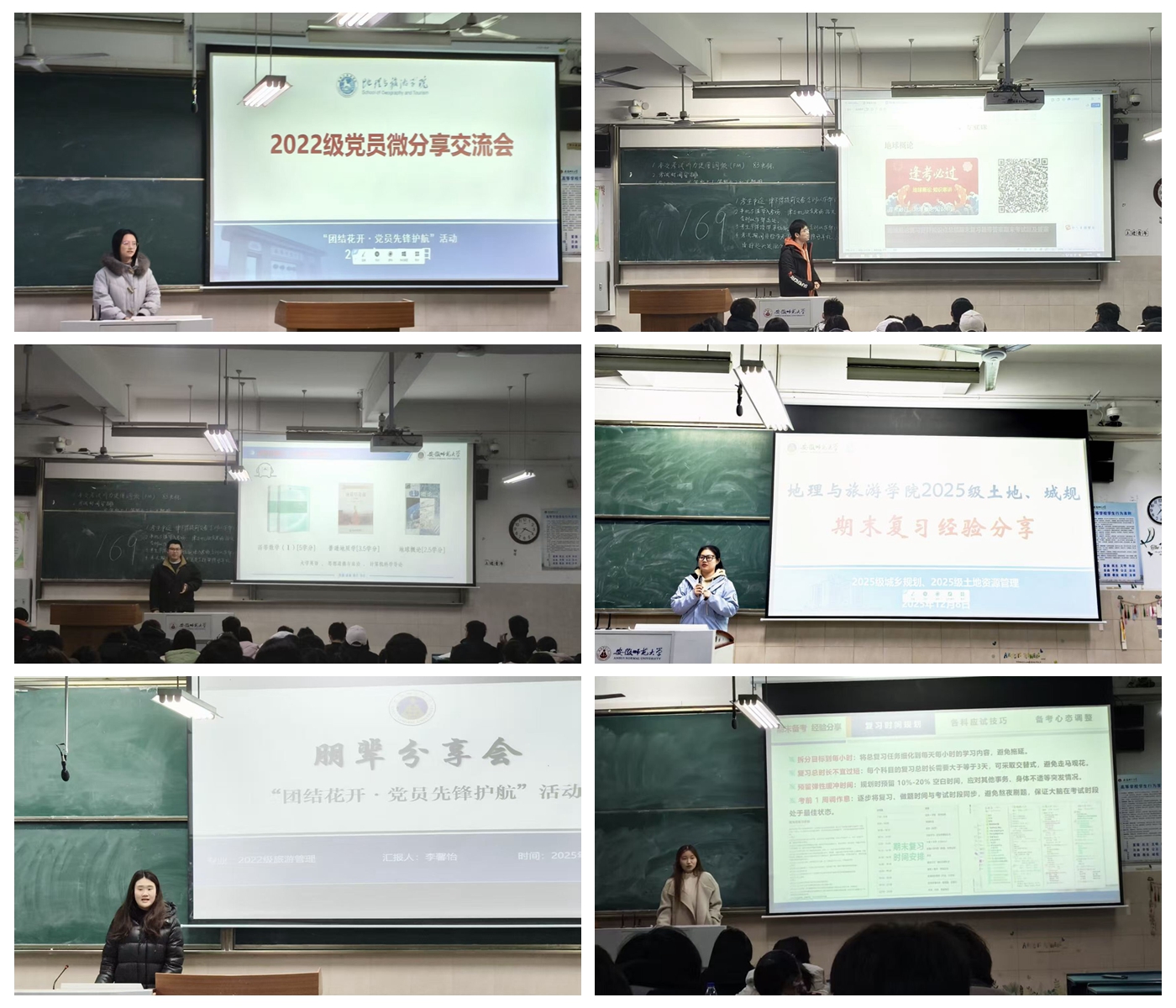 本次交流会紧密围绕期末复习与学习方法展开,旨在搭建一个高低年级间无障碍沟通、经验共享的朋辈帮扶平台。分享会上,地理科学(师范)专业黄永轩、赵硕以及地理科学拔尖班吴乐伟三位同学系统梳理了专业知识体系,从整体复习规划、高效记忆方法到应试策略调整,进行了层层深入的讲解;土地资源管理专业孔子惠同学着重分享了时间管理与心态调适的技巧,帮助新生缓解备考焦虑;地理信息科学专业蒋淑媚同学针对学科特点,介绍了理论结合实践的学习路径;城乡规划专业王冰冰同学则鼓励新生拓展视野,积极参与学科竞赛与科研项目,全面提升综合素养;旅游管理专业李馨怡同学结合自身成长经历,就课程学习与生涯规划提供了指导建议。