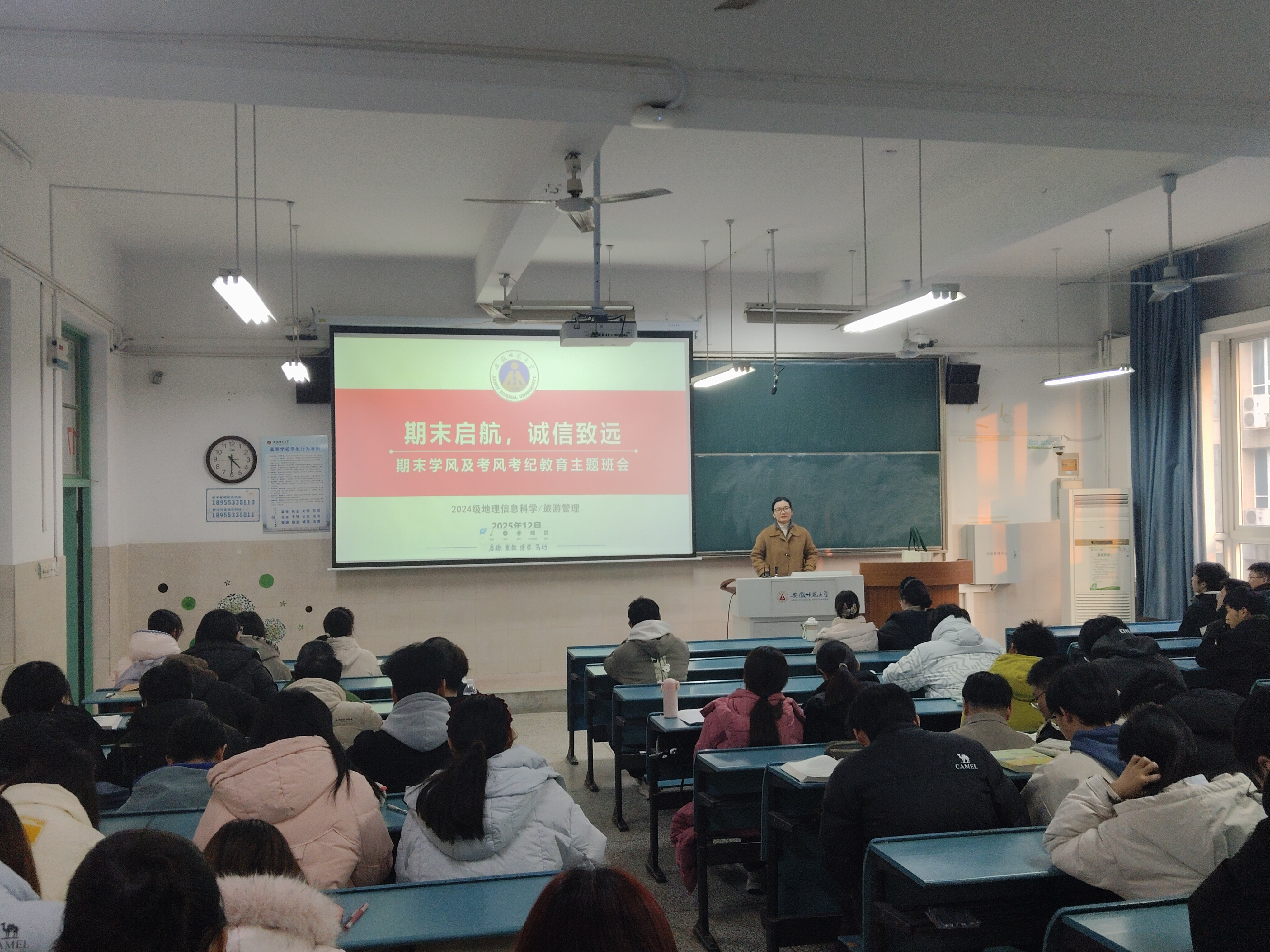 为引导学生科学备考、严肃考风考纪,营造积极向上的学习氛围,12月25日,我院2024级地理信息科学、旅游管理专业召开了期末学风建设与诚信考试主题班会。班会由辅导员韦银艳主持。