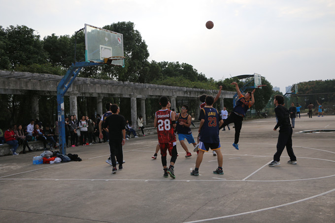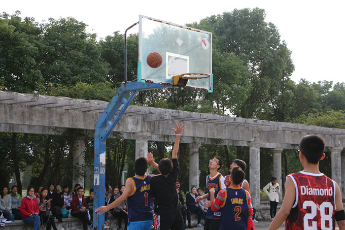 下午3点整,篮球场一侧早已坐满了前来加油助威的同学,短暂的热身之后,双方运动员在一声声的欢呼呐喊中迅速进入状态。随着裁判员一声哨响,双方队员开始跳球,现场的气氛急剧攀升。“辉辉队”率先拔得头筹拿到2分,场下观众连连叫好,此时“将将队”的队员也不甘示弱,在完美的配合之下拉回了比分,一时僵持不下,比赛愈演愈烈,观众的热情也空前高涨,最终上半场“辉辉队”以26:18暂时领先。