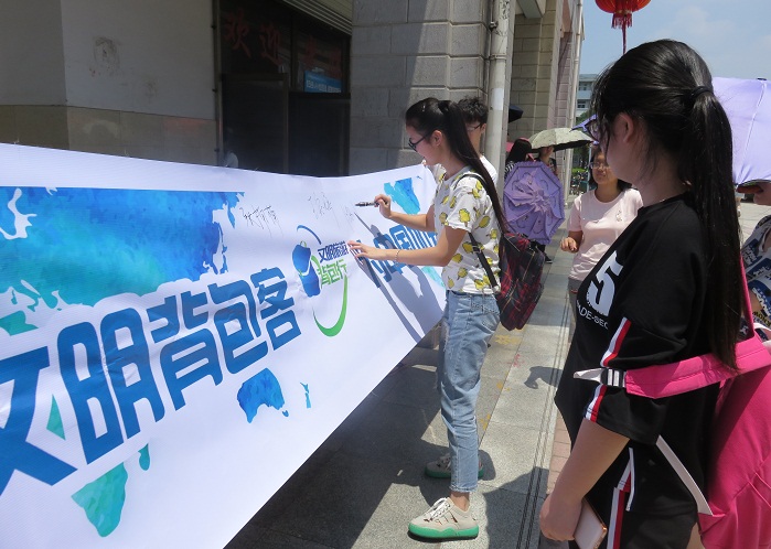 暑期社会实践团队尚未“出征”,“粮草”却已先行,6月17日中午,赴四省八市“新旅游 新风尚”旅行公益计划团队于花津校区一食堂门口开展“文明背包客,为中国加分”大型宣讲签名活动,受到广大师生的关注和欢迎。