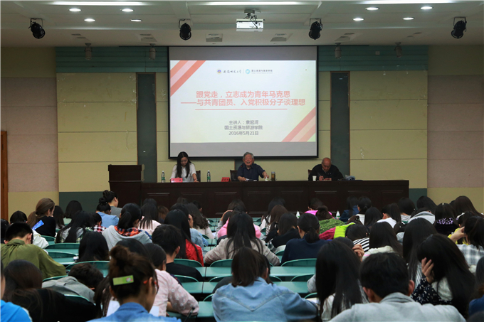 )5月21日下午,校关工委常务副主任、原校党委副书记袁起河在国旅实验楼101报告厅作了题为“跟党走,立志成为青年马克思”的报告会。国旅91论坛