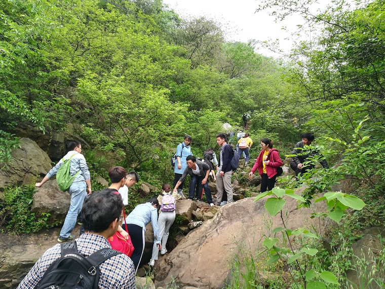 随后,同学们前往相邻的麒麟山顶进行林地解译实践。由于前一天晚上下雨,地面湿滑,林木丛生,碎石较多,山路也较陡峭,愈到山顶,水汽愈重,可谓困难重重。一路上同学们互帮互助,不断坚持。老师们也在沿途耐心讲解,保护同学们的安全。鼓励和笑语中,一行人最终顺利到达山顶。