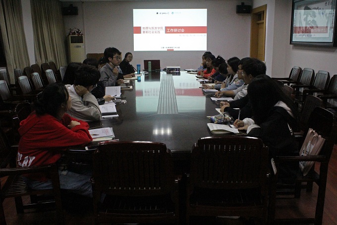 暑期社会实践研讨会在院行政楼三楼会议室举行。会议由团委书记吴辉主持。团委副书记陈祥云、彭媛媛,院学生会前主席张流舰,校学生会主席秦义轩,团委学生副书记鲍晓楠,院学生会副主席朱艳,各团委委员及17级班级代表出席会议。