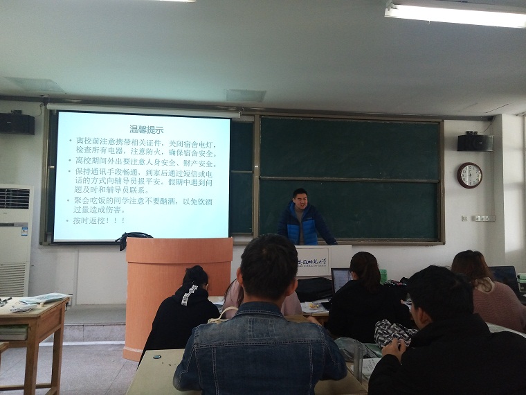 首先,副班长杨凯上台主持了“清明节离校安全主题班会”。杨凯同学提示,离校之前注意携带相关证件,关闭宿舍台灯,检查所有电器,注意防火、确保宿舍安全。离校期间外出要注意人身安全、财产安全、交通安全,注意防溺水防诈骗防传销等。保持通讯畅通,到家后通过短信或电话的方式向辅导员报平安,假期中遇到问题及时和辅导员联系。杨凯同学情真意切、慷慨激昂的提示引发了同学们对于清明节离校安全的重视,同学们纷纷对他表示感谢。