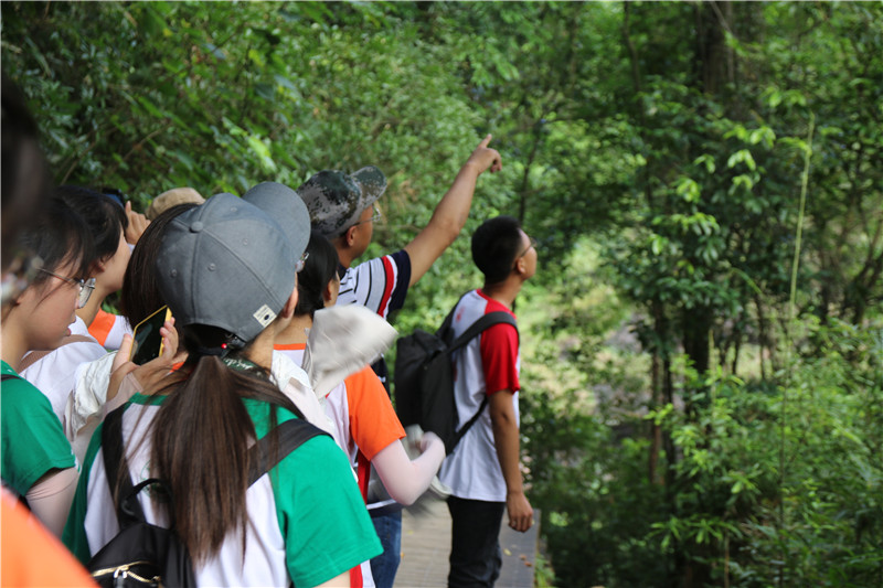 丹霞山地貌素有“顶平、坡陡、麓缓”的特点。云崖栈道便是修筑在阳元山悬崖峭壁上的登山栈道。栈道一面紧贴阳元山那些千万年前的沉积物,一面凌空,脚下便是深渊。据带队的吴立老师介绍,云崖栈道之险可以与野长城媲美。行至窄处,仅容一人侧身通过;行至陡处,栈道则近乎垂直。好在谷间清风送凉,丹霞山体蔽日。队员们相互调侃着,鼓励着,向高处不断攀登。