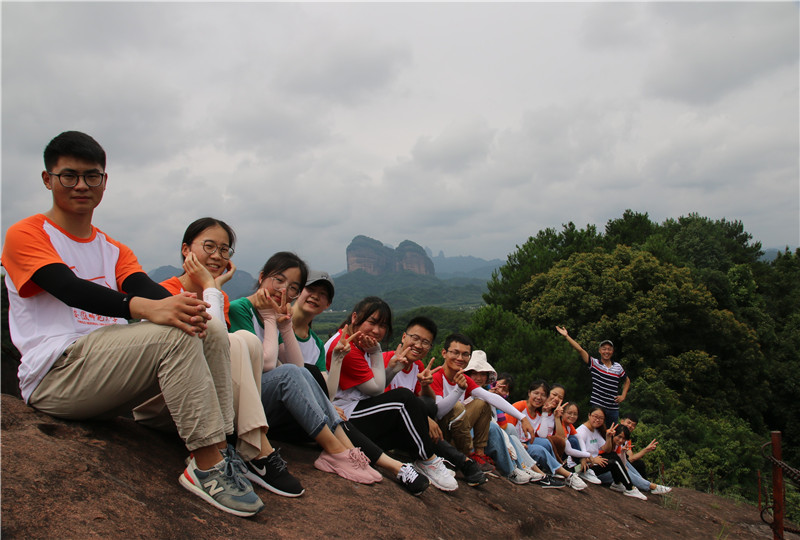 赴广东韶关“探秘幽径,邂逅丹霞”调研科普团队向云烟缭绕的丹霞山阳元石景区行进,实地调研阳元石景区丹霞地质地貌。