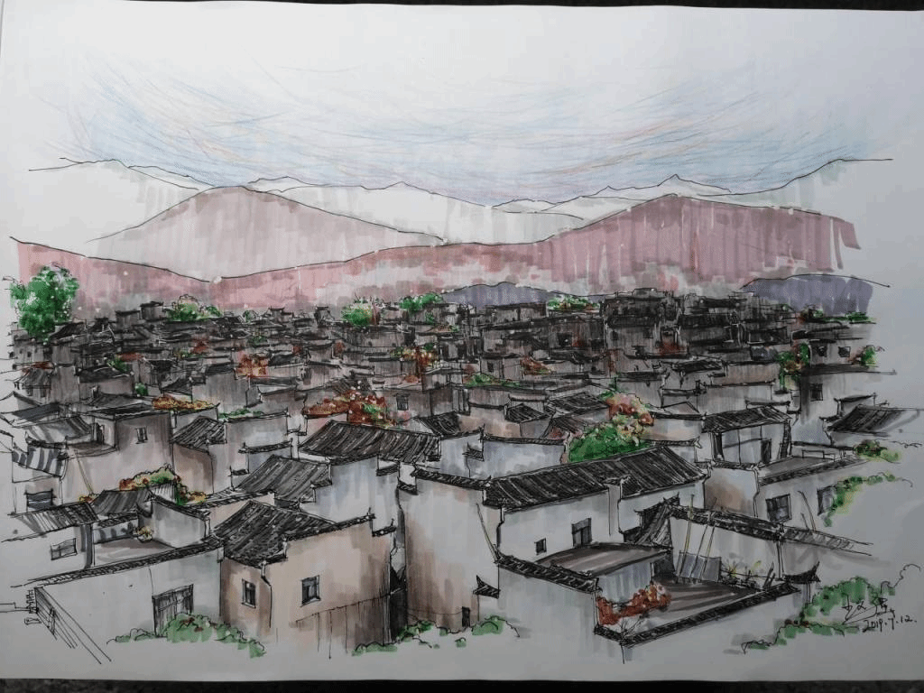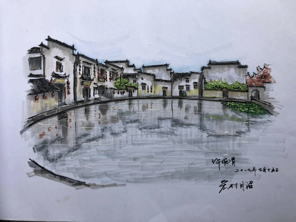 通过十天的训练,同学们对钢笔画、马克笔、水彩画等都有了新的认识。从刚开始的“配色单一”、“画风拘谨”,到最后的“用色大胆”、“构图巧妙”,同学们在这一过程中反复尝试,不断开拓新的领域,将多种绘画技法相结合,最终画出了令大家满意的作品。宏村的山水、建筑在不同人的笔下呈现出多样的美。