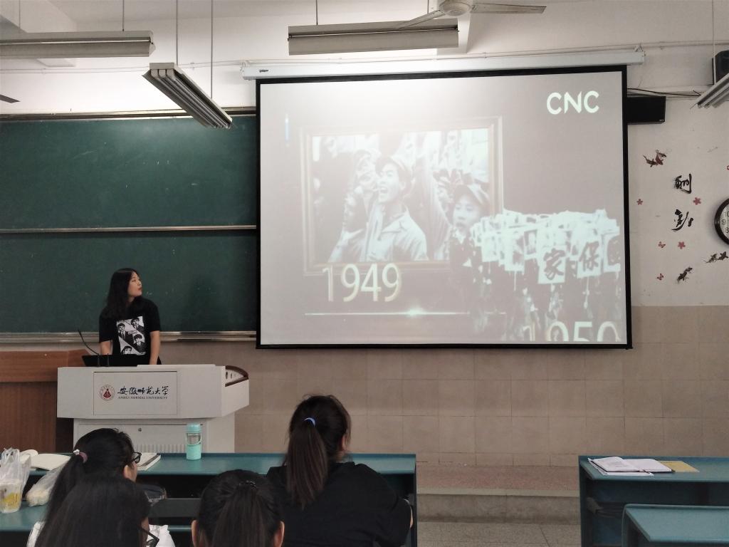 随后,同学们观看了七十周年献礼巨片——《70年岁月如歌》。该片回忆了新中国成立以来的重要历史事件,这70年披荆斩棘、风雨兼程。紧接着,同学们以团小组为单位展开了激烈的讨论,并各派一位同学代表分享观后感或者建国故事。其中,孙李家旺同学代表第三团小组上台发表观后感想,他表示先前看过这部献礼片,十分感谢祖国给予的美好的生活环境和学习环境,且表达了他刻苦学习报效祖国的决心;第一团小组代表甘舒婷同学则介绍了“中国核潜艇之父”——黄旭华隐姓埋名三十载、终生报国不言悔,为祖国建造第一代核潜的光荣事迹。