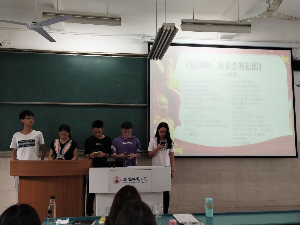 活动在声情并茂的诗歌朗诵中拉开了帷幕,“我是你河边上破旧的老水车,百年来纺着疲惫的歌……”第五团小组的同学深情地朗诵了舒婷的这首《祖国啊,我亲爱的祖国》,歌颂伟大的祖国母亲。