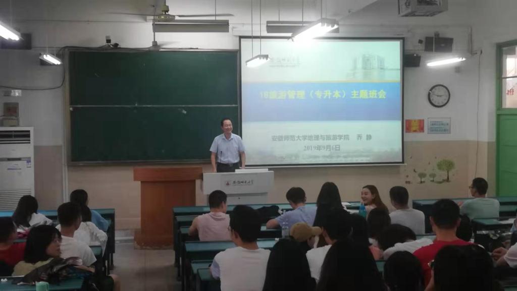 韩红豆)9月6日下午,2018级旅游管理(专升本)专业在行知楼4号楼104教室召开主题班会,2018级旅游管理(专升本)专业全体同学参与此次会议,院党委副书记、2018级旅游管理(专升本)兼职辅导员乔静主持。