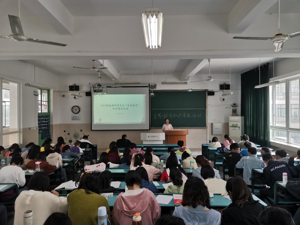孙夏路遥)10月22日,2017级地理科学专业生命教育知识普及活动在2040303教室开展,班级全体同学积极参与,活动由心理健康委员王森雨主持。