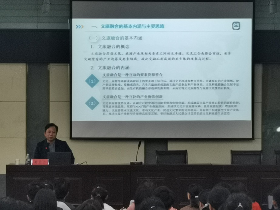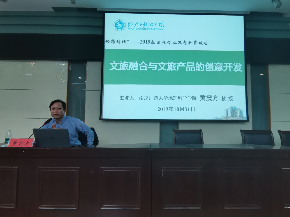黄震方教授来我院讲学,报告会由苏勤院长主持,旅游管理专业负责人杨效忠老师、城乡规划专业负责人杨兴柱老师、专业课教师王咏、余伶莲、韩卢敏、刘云霞老师也来到现场。