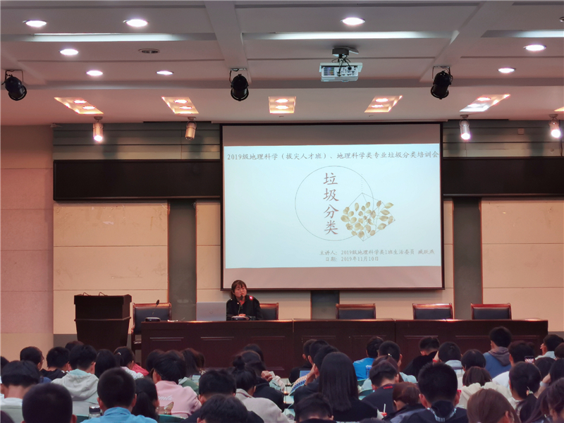 实验楼101报告厅召开垃圾分类主题班会,2019级地理科学(拔尖人才班)、2019级地理科学类1班、2019级地理科学类2班全体同学参加会议。会议由辅导员齐小学主持。
