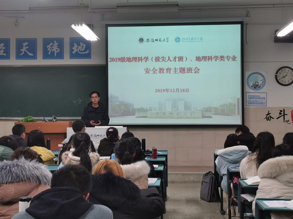 江文萱 齐小学)12月18日晚,2019级地理科学大类在行知楼2040104、2040501教室召开安全教育主题班会,2019级地理科学(拔尖人才班)、2019级地理科学类专业全体同学参加班会。班会由辅导员齐小学主持。
