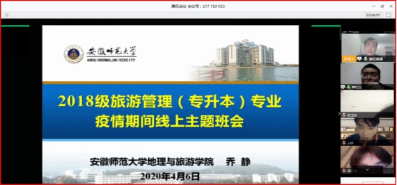 田思琦)为响应学校疫情防控期间稳步推进毕业生就业、考研以及安全维稳等相关工作, 2018级旅游管理(专升本)专业于2020年4月8日召开线上主题班会,2018级旅游管理(专升本)专业全体同学参与此次会议,院党委副书记、2018级旅游管理(专升本)兼职辅导员乔静主持并讲话。