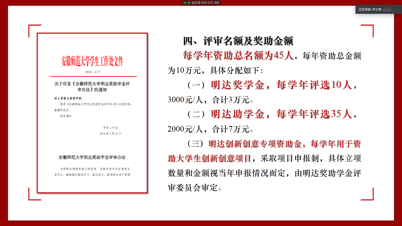 设立的社会奖助学金。自2016年设立以来以成功评选过4届,共资助了140名学生。对此,在评选过程中一定要严格标准、公平公正、认真细致,推选出最佳人选供评审委员会审核、确认,切实发挥出明达奖助学金资助育人、培优助困的积极作用。
