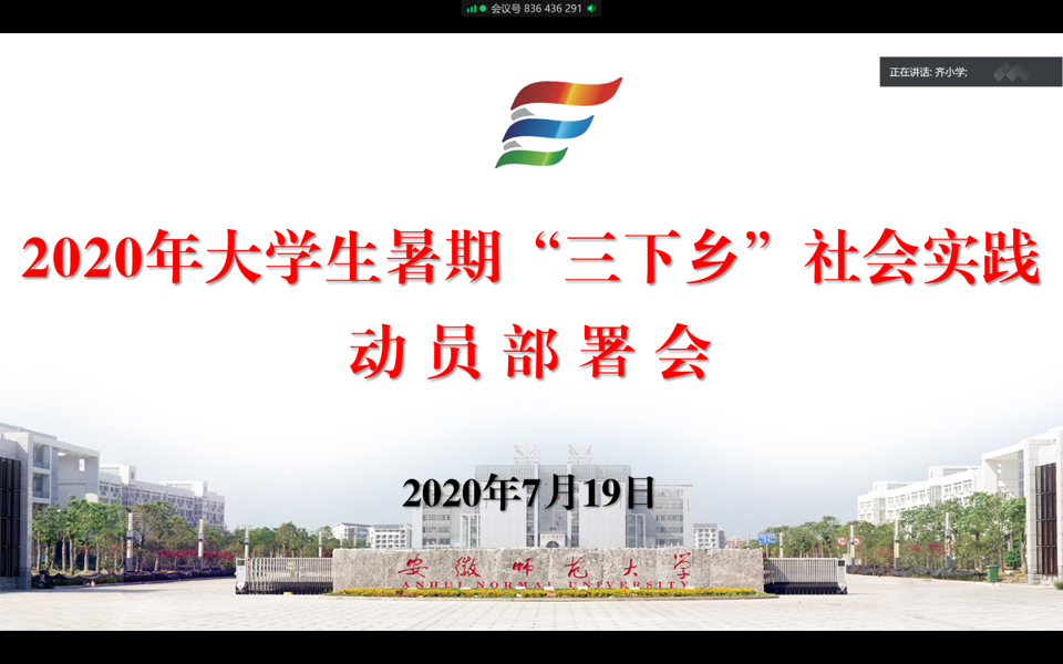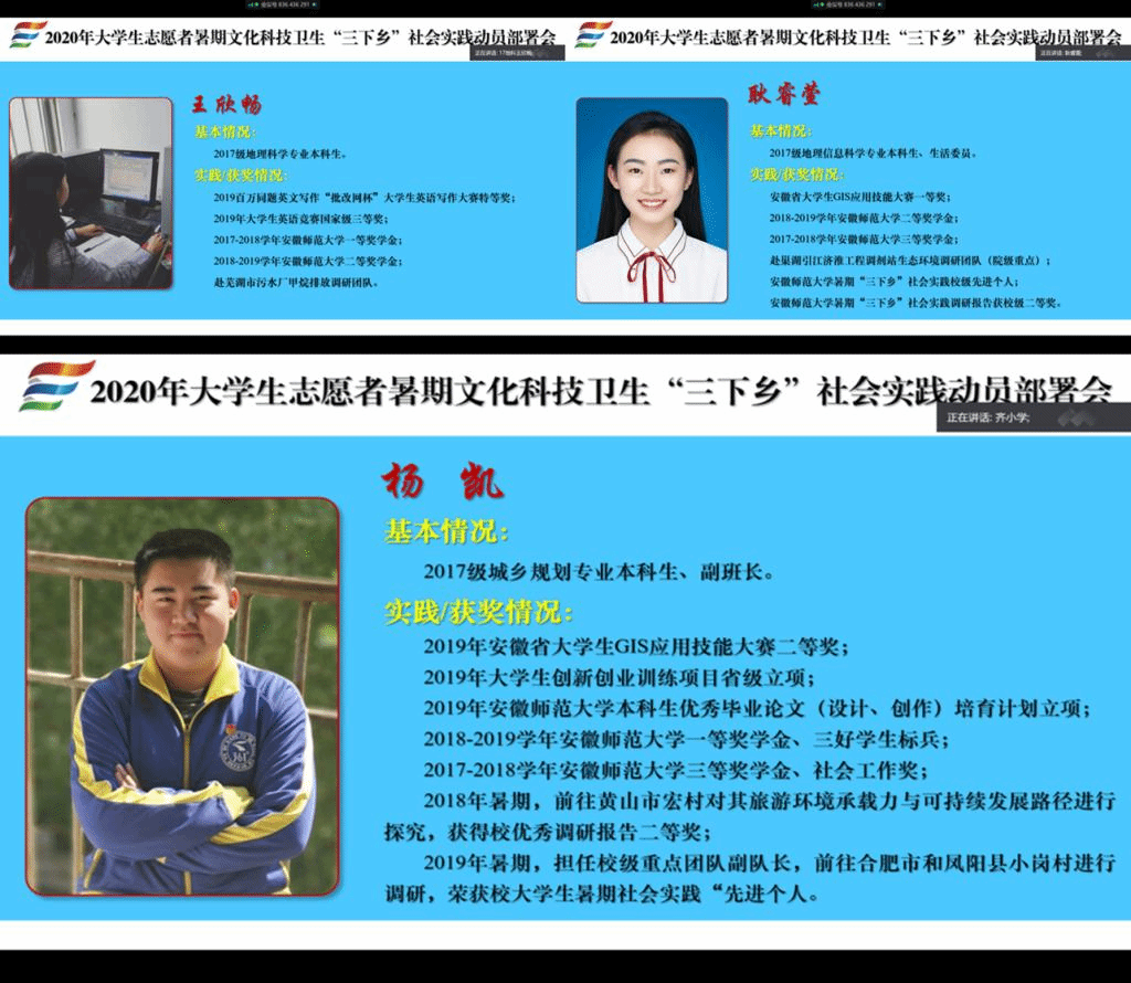 武诺 齐小学)为深入贯彻落实学校关于大学生暑期社会实践重要精神,积极动员、扎实推进2020年大学生暑期社会实践,7月19日晚,2019级地理科学大类通过腾讯会议平台召开2020年大学生暑期“三下乡”社会实践动员部署会。2019级地理科学类1班、2班和地理科学(拔尖人才班)全体同学参加会议,2017级地理专业王欣畅、2017级地理信息科学专业耿睿萱和2017级城乡规划专业杨凯受邀与会。会议由辅导员齐小学主持。