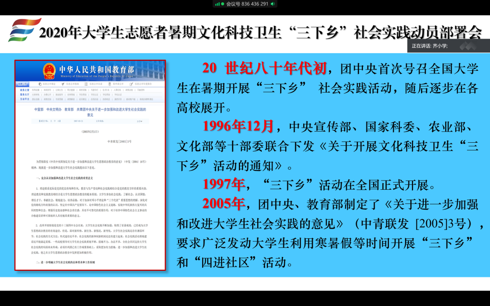 会议伊始,齐小学带领全体与会人员回顾了大学生暑期文化科技卫生“三下乡”社会实践的发展历程。他表示,大学生暑期“三下乡”社会实践自1997年在全国范围内开展以来已经走过了23年的历史,形成了系统完备的运行体系和活动内容,成为广大青年学生走向社会、了解国情、历练成长的广阔平台,更是在校大学生受教育、长才干、做贡献、做贡献的重要载体,同学们一定要高度重视、认真准备、积极参加,让青春绽放在祖国和人民最需要的地方。