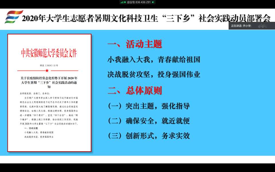 随后,齐小学领学了学校关于开展大学生暑期“三下乡”社会实践活动通知的文件精神。他强调,此次暑期社会实践是在新冠肺炎疫情防控常态化、当前洪涝灾害多发频发的特殊背景下启动的,大家必须把安全放在第一位,结合活动主题、总体原则和专业特色,按照文件要求和时间节点积极申报项目、组建团队、开展活动,及时做好活动实践成果固化工作,争取产出一批有影响有价值有意义的成果,坚决杜绝搞形式、走过场,实现通过暑期社会实践经风雨、见世面、强筋骨、增本领的最终目标。