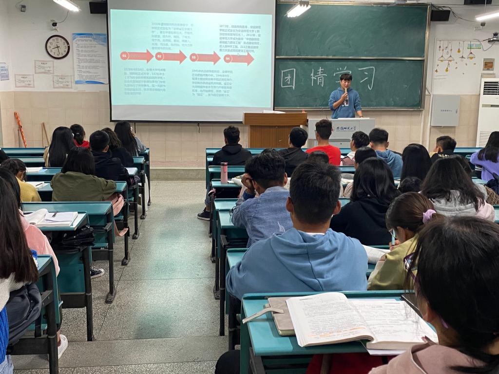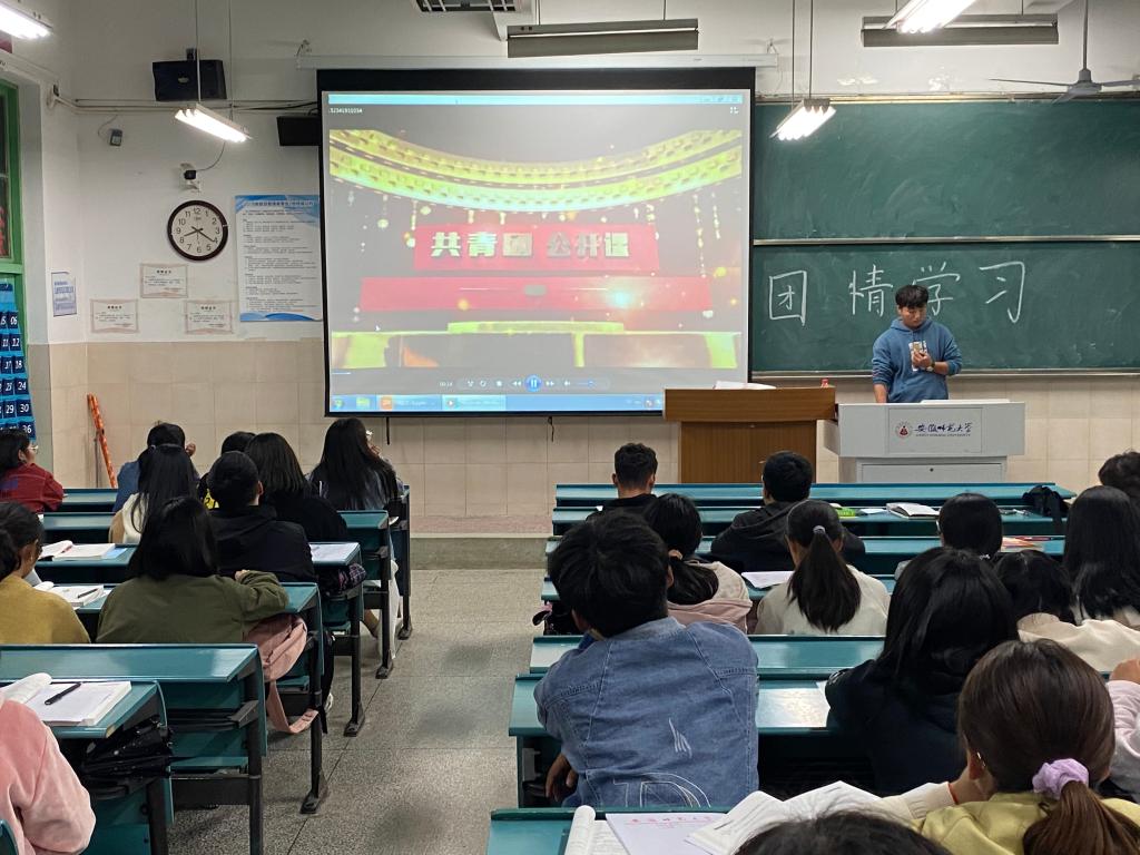 活动伊始,二班团支书孙浩男同学带领大家学习共青团团情,从“团旗,团徽,团歌,中国少年先锋队”四个方面切入正题。随后开展三会两制一课相关学习内容,并带领大家观看共青团公开课,加深同学们对共青团中央的理解,提高团员思想理论水平。