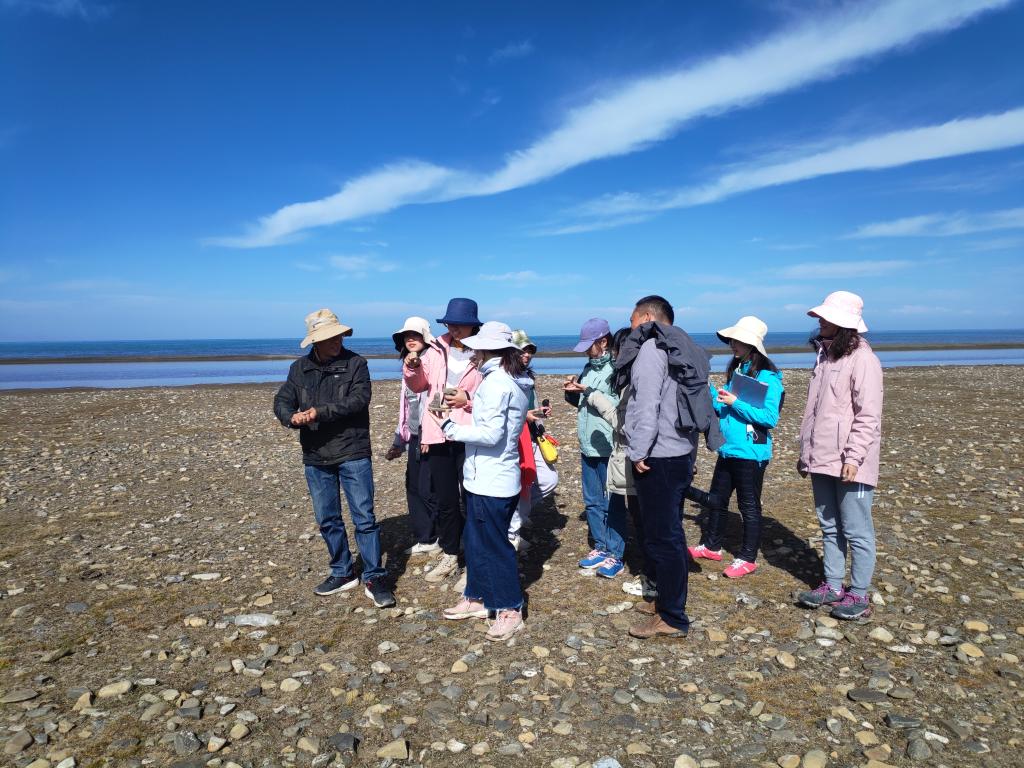 青海湖,藏语名为“措温布”(意为“青色的海”),长105公里,宽63公里,湖面海拔3196米,是中国最大的内陆湖泊,地处青藏高原的东北部,西宁市的西北部,位于东经99°36′~100°16′之间,北纬36°32′~37°15′之间。由祁连山脉的大通山、日月山与青海南山之间的断层陷落形成。程先富向同学们讲解了青海湖由淡水湖向咸水湖演变的过程,强调了气候变化与新构造运动对青海湖水文环境的影响,以及降水量与蒸发量间的不均衡关系造成的长期盐分累计。程先富以细致入微的讲解从因到果分析结构、演变以及发展,使同学们对知识的理解更加通透。