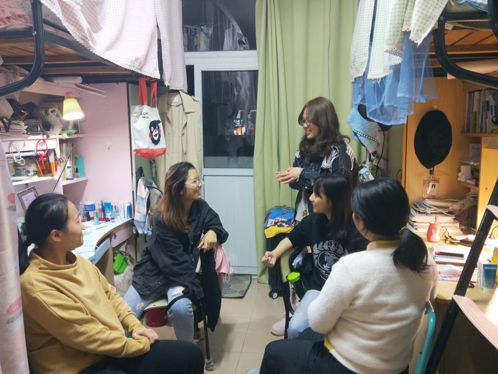 为进一步提升主题班会的教育成效,了解班级同学的心理状态,班会结束后,孙若情和张子豪分别深入女生和男生寝室,与同学们进行密切交谈,了解同学们的最近一段时间的想法和困惑。对于情绪低落或是压力较大的同学,孙若情也积极给予心理辅导,帮助同学们解决问题。此次寝室访谈中,同学们在这种轻松的氛围中敞开心扉,释放了学业的压力,加深了彼此的感情。