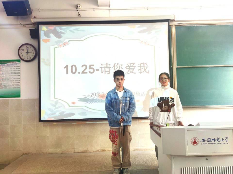 拥抱心理健康,幸福健康人生。以传播心理健康教育知识、营造班级心理健康关怀氛围为主要目标,2020级旅游管理召开一次“10.25邀您爱我”的心理健康关怀主题知识教育活动。活动从主持人对“心理健康的实质、标准以及在理解和把握心理健康标准时应注意的问题”的探讨来展开序幕,用精湛语言对其进行逐一解释说明,让同学们对心理健康拥有自己的一个“心”认识。