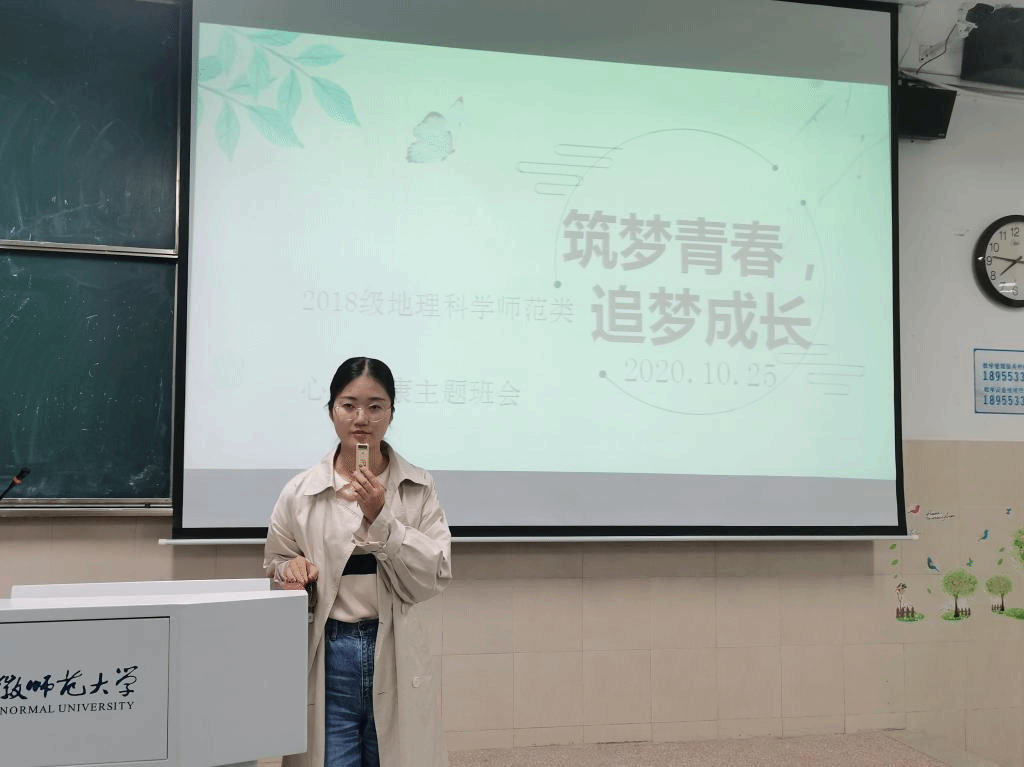 陈冬阳 丁茹栩)为进一步加强大学生心理健康教育工作,宣传普及心理健康知识,形成正确的心理健康观念,营造良好的心理健康氛围,以“筑梦青春,追梦成长”为主题,2018级地理科学师范类专业成功开展“‘10· 25’大学生心理健康月”系列活动。此次活动由辅导员丁茹栩指导进行,班级全体成员参加。